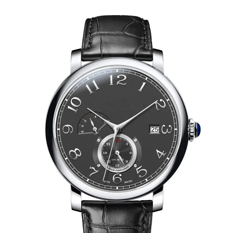 Wearing this men’s wristwatch elevates your fashionable look. Its waterproof feature resists water effectively. Equipped with an auto date feature. it’s practical and stylish. What sets this luxury watch apart is its automatic self-wind movement. The durable stainless steel case safeguards its movement. The genuine leather strap complements its style.