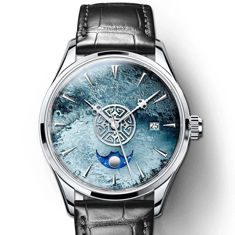 Make a serious step to add a style touch to your look with this men’s wristwatch. Crafted with a stainless steel case and a genuine leather band. it’s durable and comfortable. The waterproof construction ensures longevity. It boasts automatic self-wind movement and intricate details. making it a must-have accessory that combines style and functionality. Don’t miss out on this awesome wristwatch.